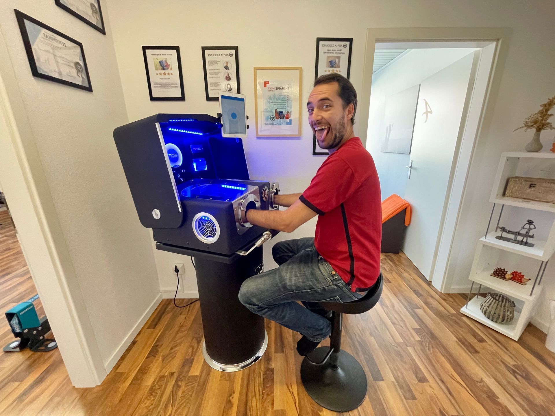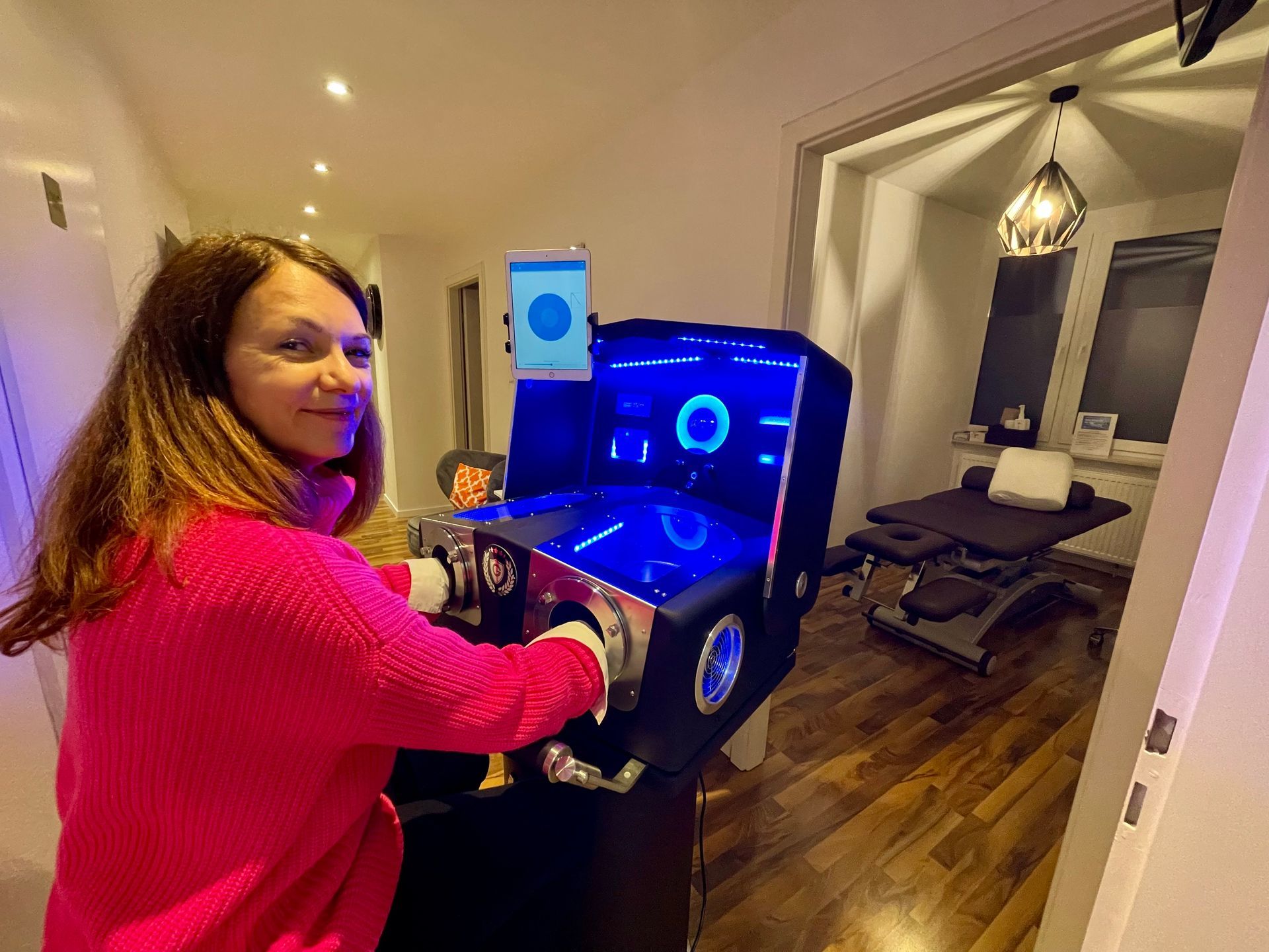 Anwender sitzen bequem vor dem Gerät, legen die Hände auf die Kühlflächen und genießen die